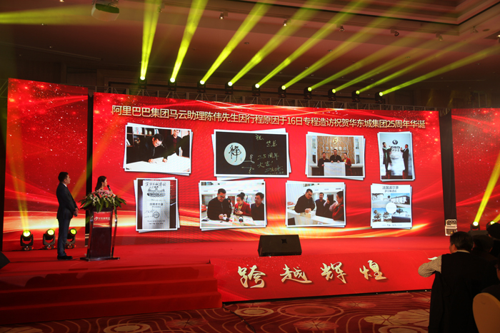 阿里巴巴集团马云与助理陈伟先生,祝贺华东城集团25周年华诞,并授予华东城集团为阿里巴巴太极禅院宁波文化驿站,并送美酒祝贺晚会成功
