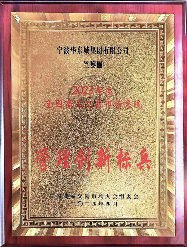 4月18日-20日,以“携手秉志谋新路·凝心筑梦展华章”为主题的第二十四届中国商品交易市场大会在山东省济南市召开。宁波华东城集团有限公司公司总经理竺黎俪女士应邀请出席了本次大会并参加了颁奖典礼。集团公司旗下宁波华东物资城荣获2023年度“全国商品交易市场服务标准化示范市场”荣誉称号。竺黎俪女士荣获“全国商品交易市场管理创新标兵”荣誉称号。